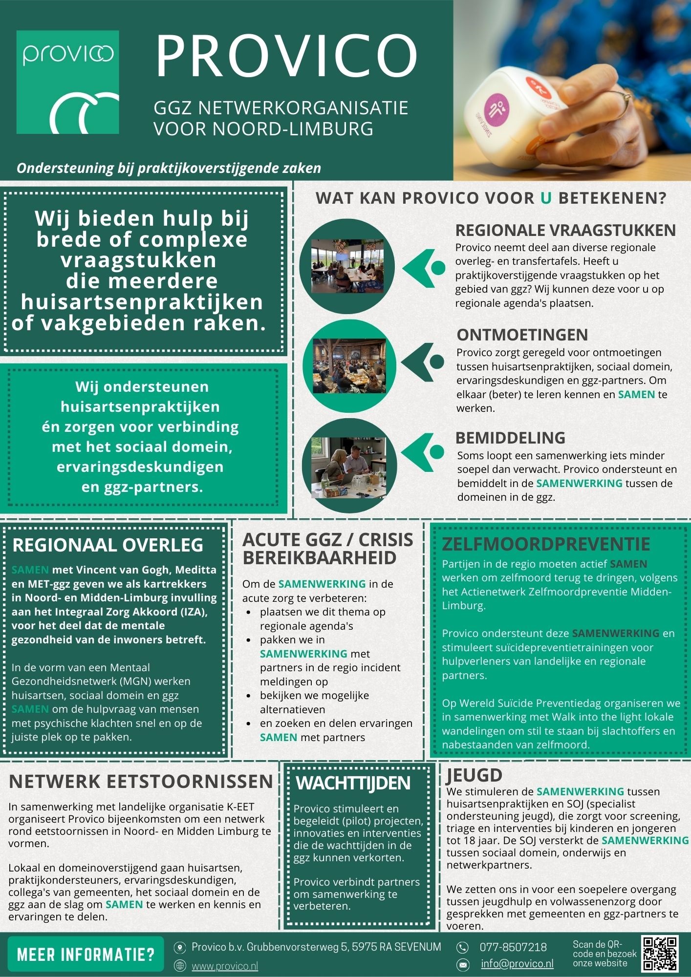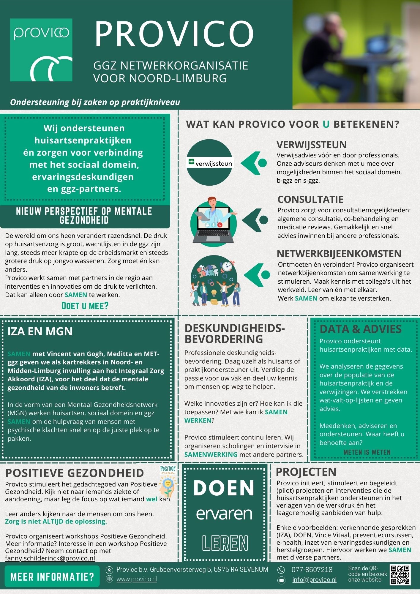 • Uitvoering van het landelijke Integraal Zorg Akkoord (IZA). Samen met Meditta, Vincent van Gogh en MET-ggz zijn we kartrekker binnen het Mentaal Gezondheidsnetwerk (MGN) voor Noord- en Midden-Limburg. Binnen het Mentaal Gezondheids Netwerk zijn we actief binnen diverse overleg- en werkgroepen waarin we samen met meer dan 70 andere partners in de regio de handen ineen geslagen hebben om de mentale gezondheid van inwoners te verbeteren.  Lees hier meer over het Integraal Zorg Akkoord en onze deelname aan het Mentaal Gezondheidsnetwerk op onze website.